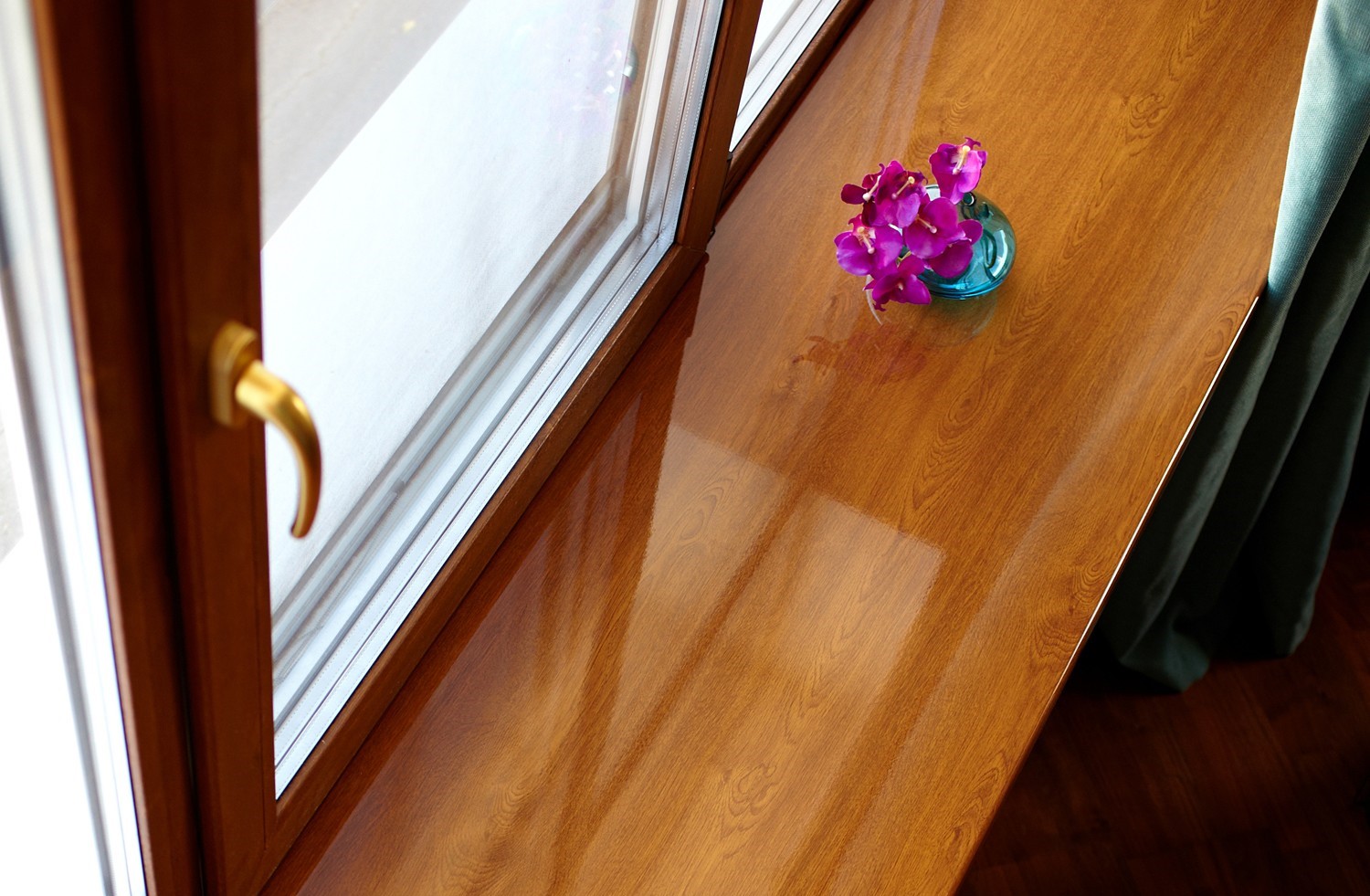 Подоконник премиум-класса Кристаллит цвета «Дуб золотой глянец» прекрасно впишется в «древесный» интерьер. Как и любой глянцевый вариант подоконника покрыт специальной акриловой пленкой для поддержания первоначального блеска.