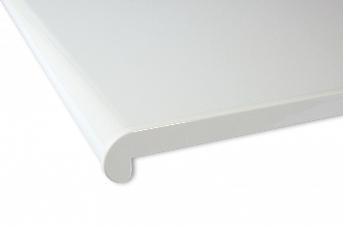 Подоконник с поверхностью Белый глянец имеет абсолютно гладкую чисто белую лицевую часть. Капинос закругленный.