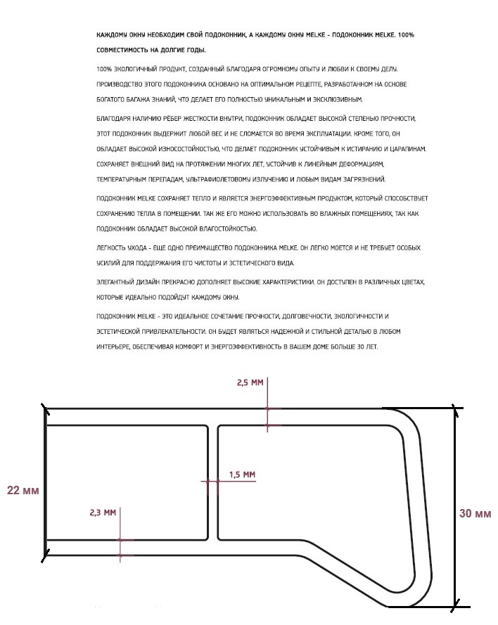 Поверхность не впитывает грязь и легко моется, не боится бытовой химии. Устойчивость к ультрафиолету действительно поразительная – даже прямые лучи не повредят покрытию и цвету. Подоконники Melke не гниют, не ржавеют, устойчивы к желтизне на протяжении всего срока службы.
